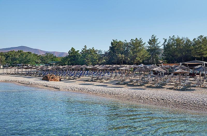 Piesočnato-kamienková pláž priamo pri hoteli (slnečníky, ležadlá a osušky pri hotelovej pláži zadarmo)