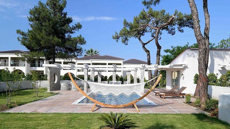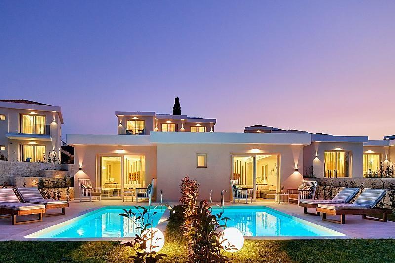 Luxusný hotelový komplex s niekoľkými budovami sa rozprestiera v pokojnej lokalite na juhu ostrova priamo pri piesočnato kamienkovej pláži. V pešej dostupnosti od hotela sa nachádza obľúbená pláž Pefkari.