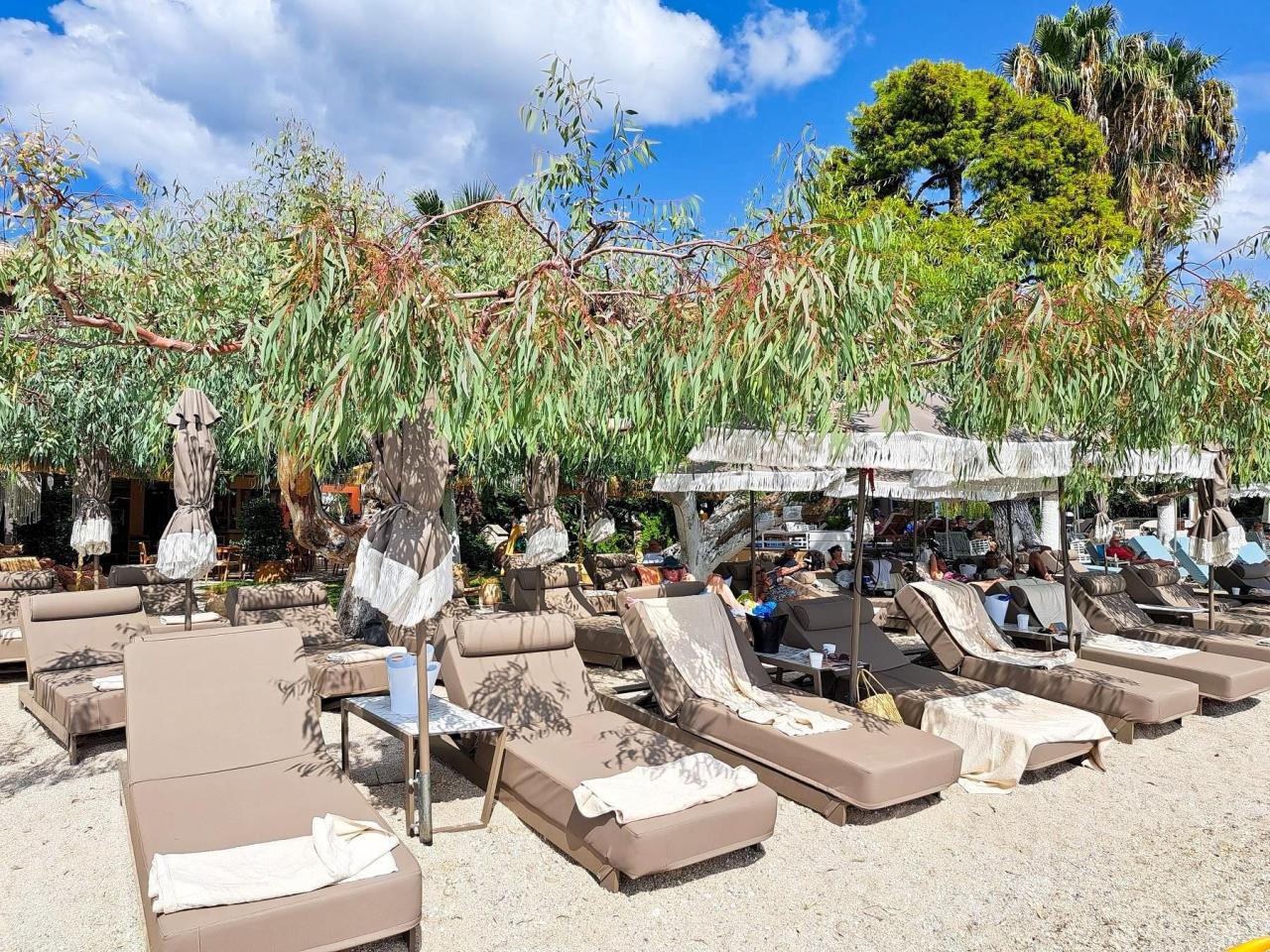 Piesočnato-okruhliakova pláž, ležadlá a slnečníky za poplatok. |