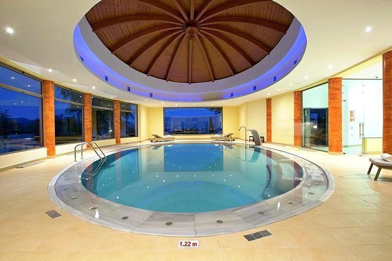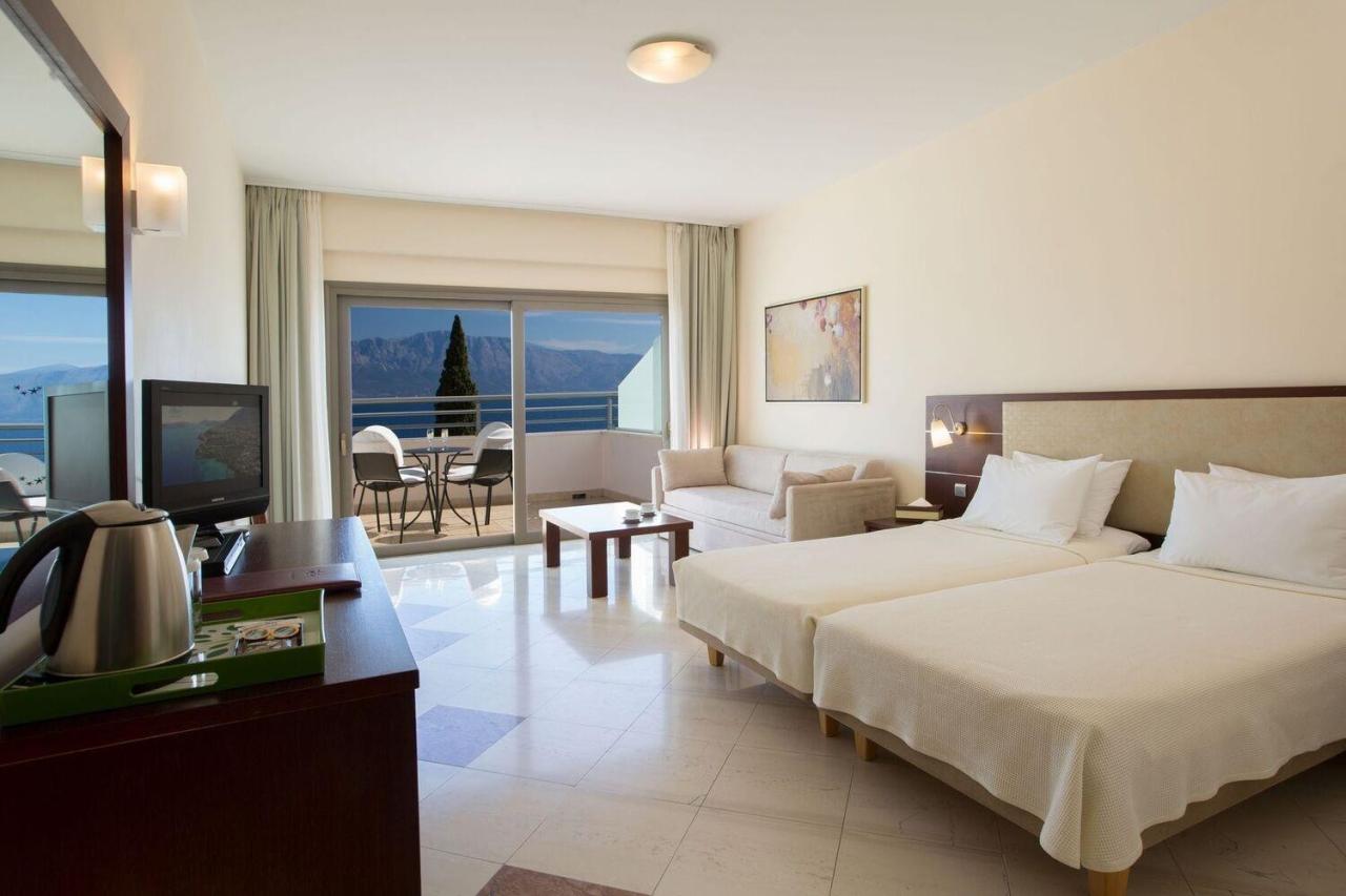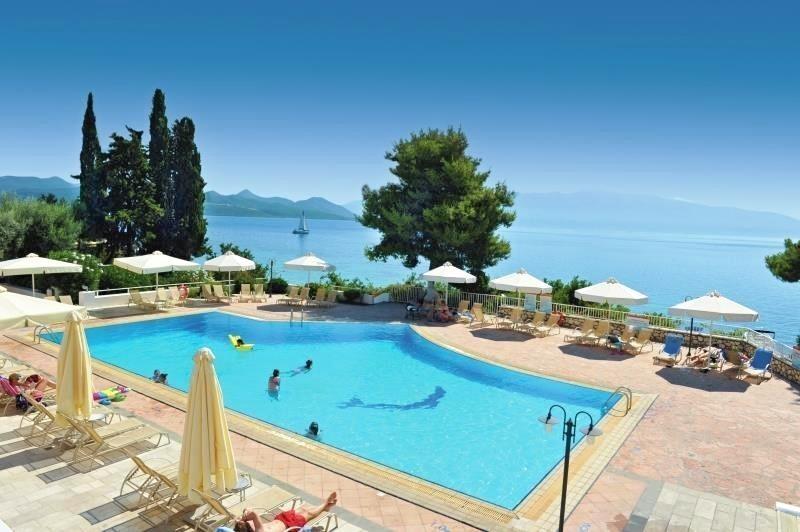 Hotelový komplex vo svahu s krásnym výhľadom na more neďaleko pokojnej dedinky Nikiana. |
